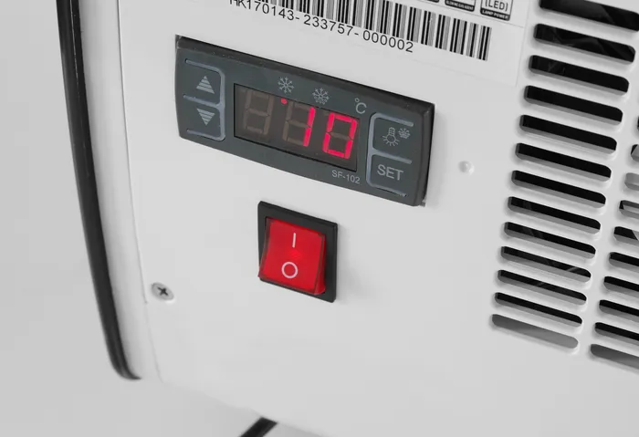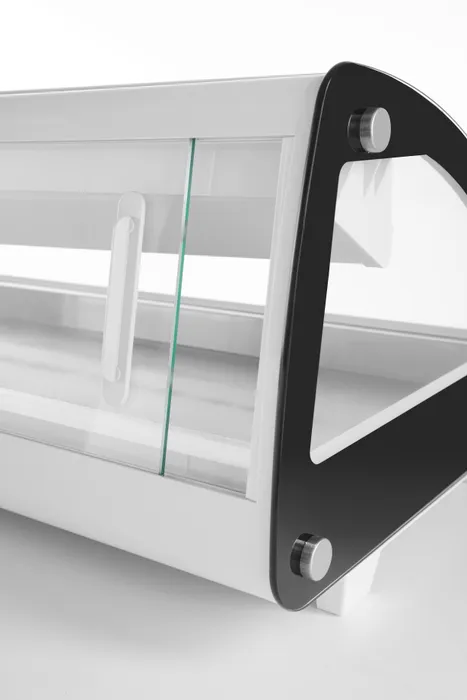 Behuizing van wit gecoat roestvrij staal, voorzien van dubbele beglazing en gebogen glazen kap. Toegankelijk via twee schuifdeuren aan de achterkant of via de gebogen glazen kap. Geforceerde luchtkoeling met automatische ontdooiing