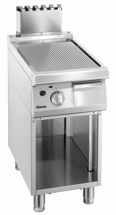 Gas bakplaat van het merk Bartscher. Het apparaat is voorzien van een geribbelde bakplaat en heeft een vermogen van 7kW. Aardgas H Mondstukken voor vloeibaar gas en aardgas L zijn bijgevoegd. Uitvoering braadoppervlak 320 x D 445 mm