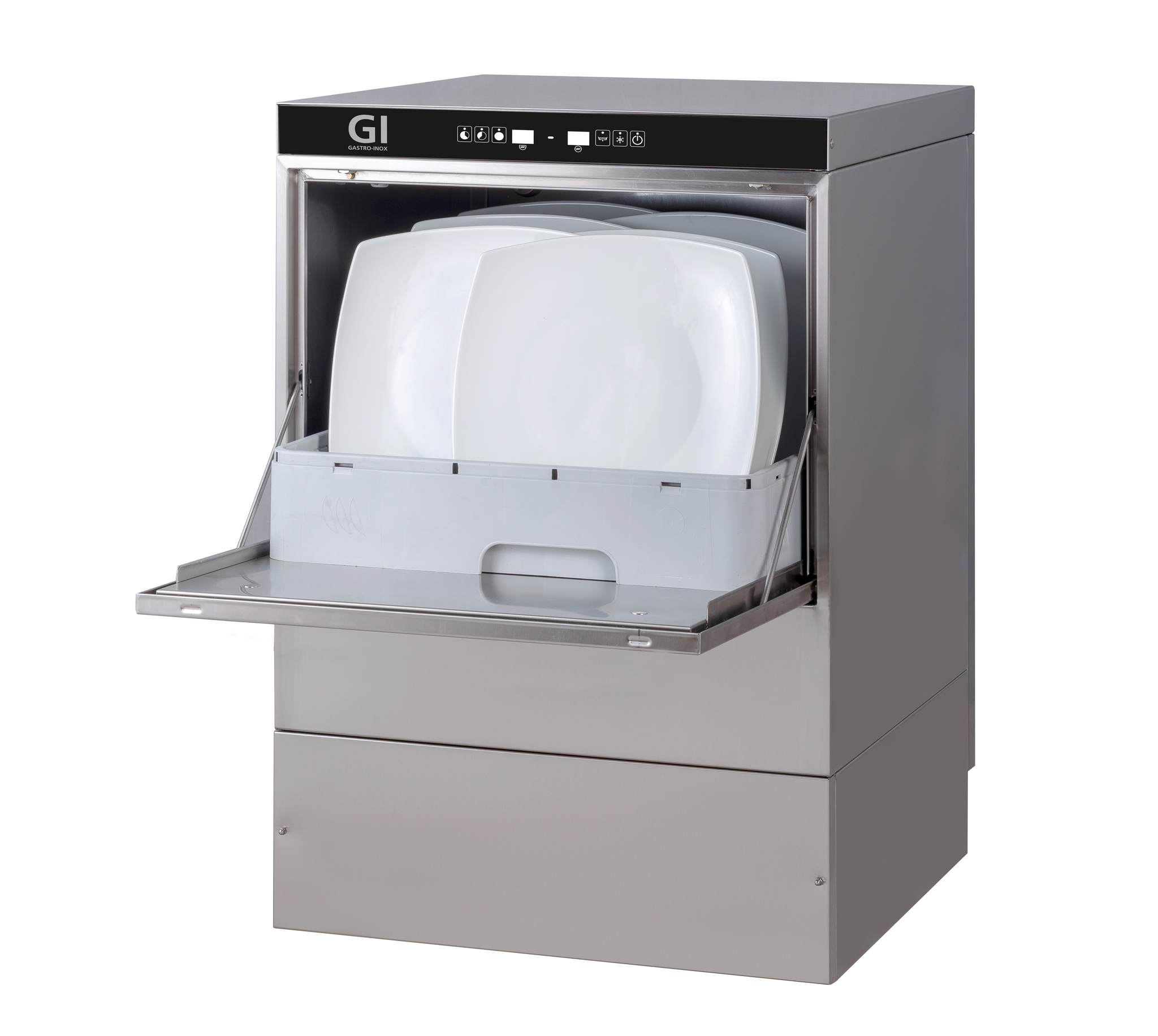 gastro Inox digitale vaatwasmachine met afvoerpomp, zeepdispenser en naglanspomp.  Vermogen 230V / 3.6kW. Compleet met 2 vaatwaskorven 50x50 cm, bestekbeker en aan- en afvoerslangen Lees meer
