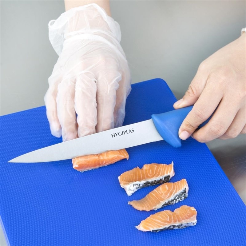 Dit fileermes van Hygiplas heeft een lemmet van hoogwaardige kwaliteit RVS en een kleurgecodeerd, vaatwasserbestendig heft. Het blauwe heft geeft aam dat het mes bedoeld is voor het snijden van rauwe vis.