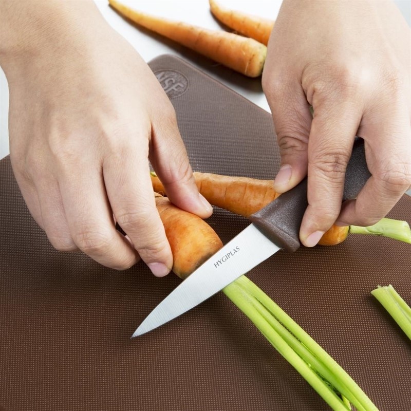 Dit officemesje van Hygiplas is gemaakt van hoogwaardige kwaliteit RVS en is voorzien van een kleurgecodeerd, vaatwasserbestendig heft. Dit mes heeft een bruin heft en dat betekent dat het geschikt is voor het snijden van bereid vlees.