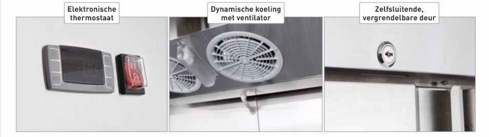 Ruime koelkast met 6 schappen en een bodem waar je producten kan stallen. De ventilator blaast de koude lucht van bovenin door de ruimte. De deur is voorzien van een slot. Koelruimte geschikt voor GN 2/1 bakken. Lees meer