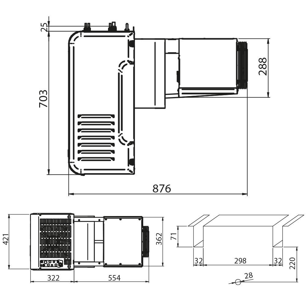 Koelunit breedte 400 mm, weinig ruimtebeslag. Koelvermogen 975 (W/f) voor kamerinhoud 6 m³/6000L (interne T° 0°C & externe T°+32°C). Lees meer