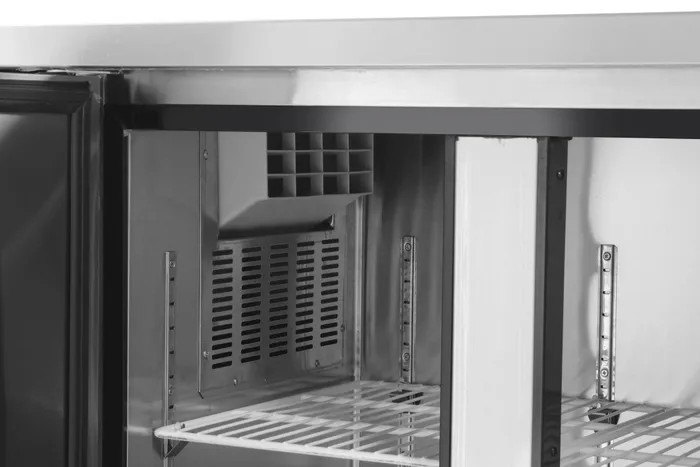 De binnen- en buitenbehuizing zijn gemaakt van hoogwaardig roestvast staal Zelfsluitende deuren met comfortabele handgrepen. Werkblad voorzien van een 40 mm hoge nok aan de achterkant. Geforceerde luchtkoeling met automatische ontdooiing, compressor geplaatst onder de koelruimte.