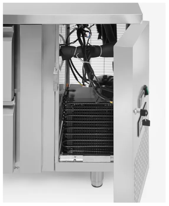 Ruime koelwerkbank met 4 laden en een grote blad biedt veel werkruimte. De binnen- en buitenzijde zijn gemaakt van hoogwaardig roestvast staal, behalve de achterzijde. Lees meer
