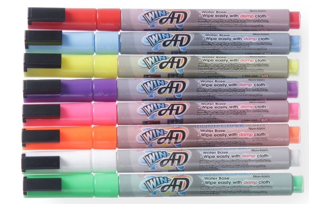 - 1 witte, 1 rode, 1 blauwe, 1 groene, 1 gele, 1 paarse, 1 oranje en 1 roze stift
