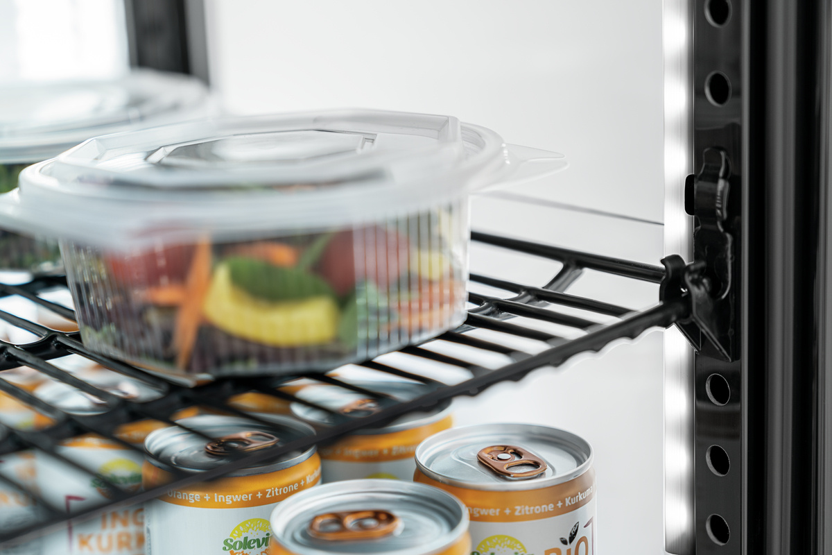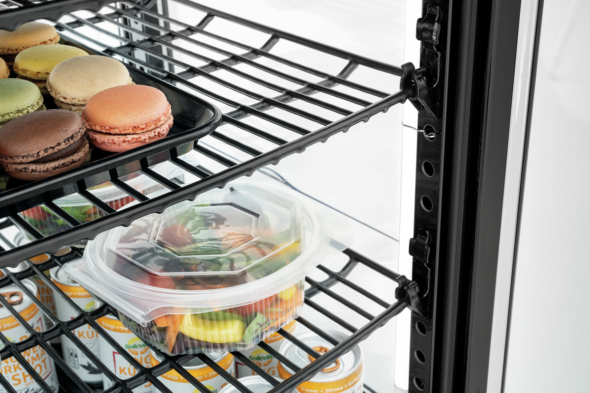 De glazen vleugeldeuren aan beide zijden maken een flexibele bezetting en leeghalen mogelijk – perfect voor gebruik in de hectische dagelijkse praktijk van de horeca. Dubbele beglazing en luchtgeleiders voorkomen op betrouwbare wijze dat de ruiten beslaan – uw producten blijven altijd zichtbaar en smakelijk. Verchroomde, kunststof gecoate roosters en hoogwaardige materialen garanderen een lange levensduur – ideaal voor intensief gebruik in keukens en verkoopruimtes. Dankzij de geïntegreerde ontdooifunctie wordt het onderhoud verminderd en blijven uw producten constant gekoeld – zonder onderbreking van de werking. Ontwikkeld voor dagelijks gebruik in de verkoop en keuken, overtuigt de vitrine door doordachte details zoals stabiele legplanken en een stil circulatiesysteem.