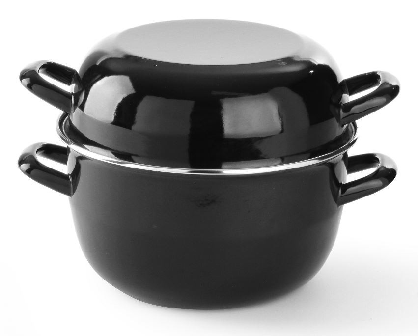 Mosselpan geëmailleerd met deksel van Hendi. Zwart geëmailleerd. Omgekraalde roestvaststalen rand.