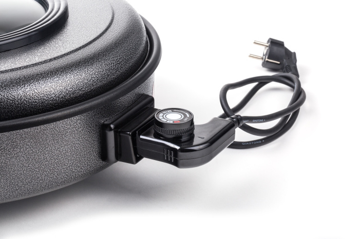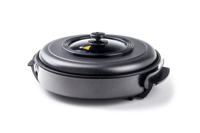 Aluminium met anti-aanbaklaag. Uitneembare thermostaat. Geschikt voor bakken, braden en warmhouden. Inclusief deksel met glazen kijkvenster en twee geïsoleerde grepen.