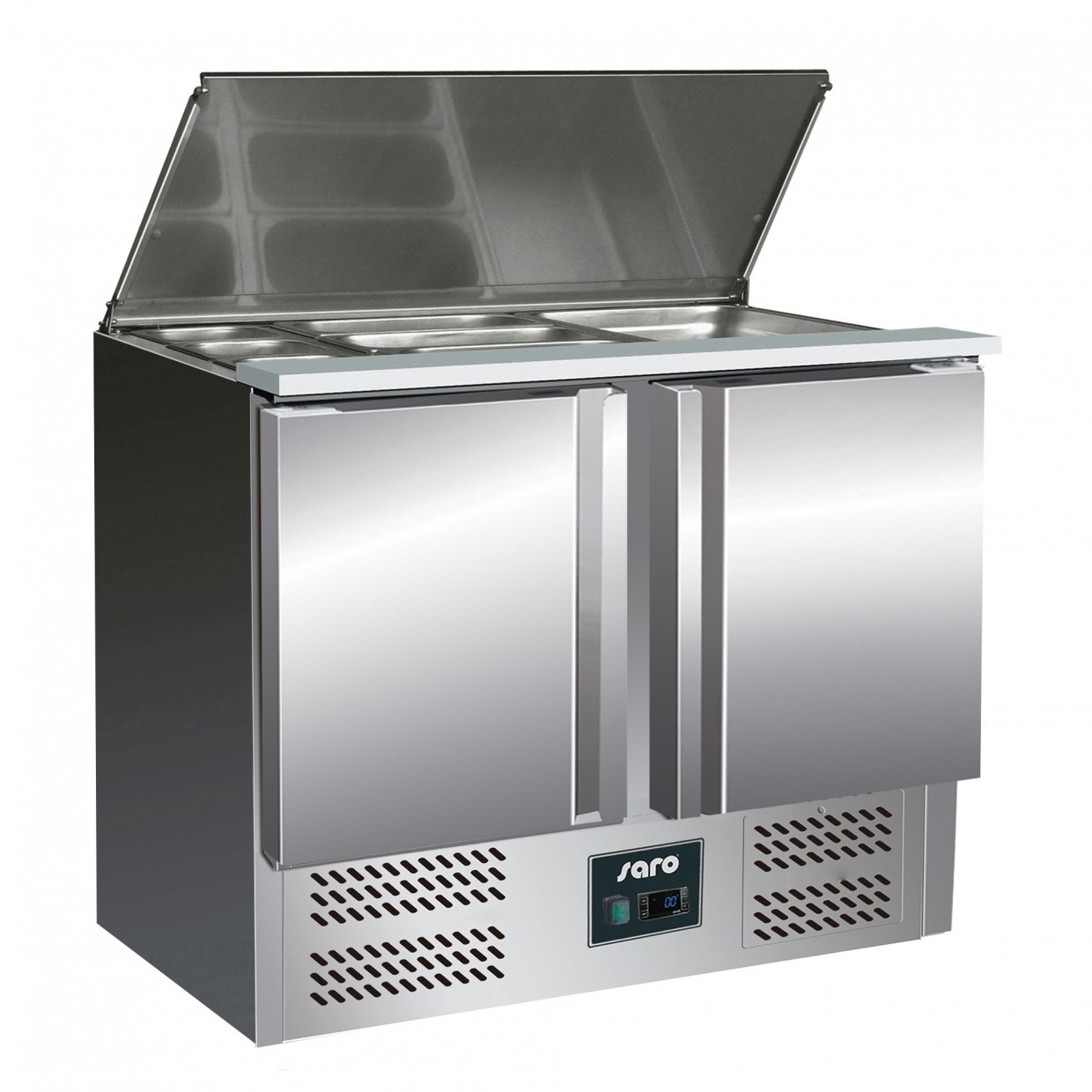 Saladette Model BALDUR S 902 met 2 deuren. Telescopische schuifdeksel. Polyethyleen snijplank. Automatisch ontdooien. Verdampte verdamper aan 3 zijden Lees meer
