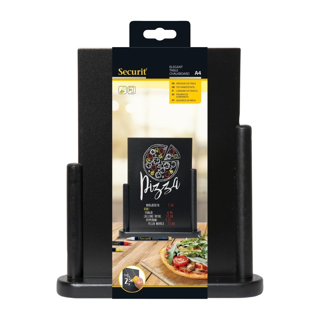 Dubbelzijdig A4 tafelkrijtbord; Perfecte manier om een menukaart, speciale aanbiedingen en evenementen te promoten; Gelakte beukenhouten basis; Voor binnen- en buitengebruik; Extra set van 3 dubbelzijdige krijtborden apart verkrijgbaar Lees meer