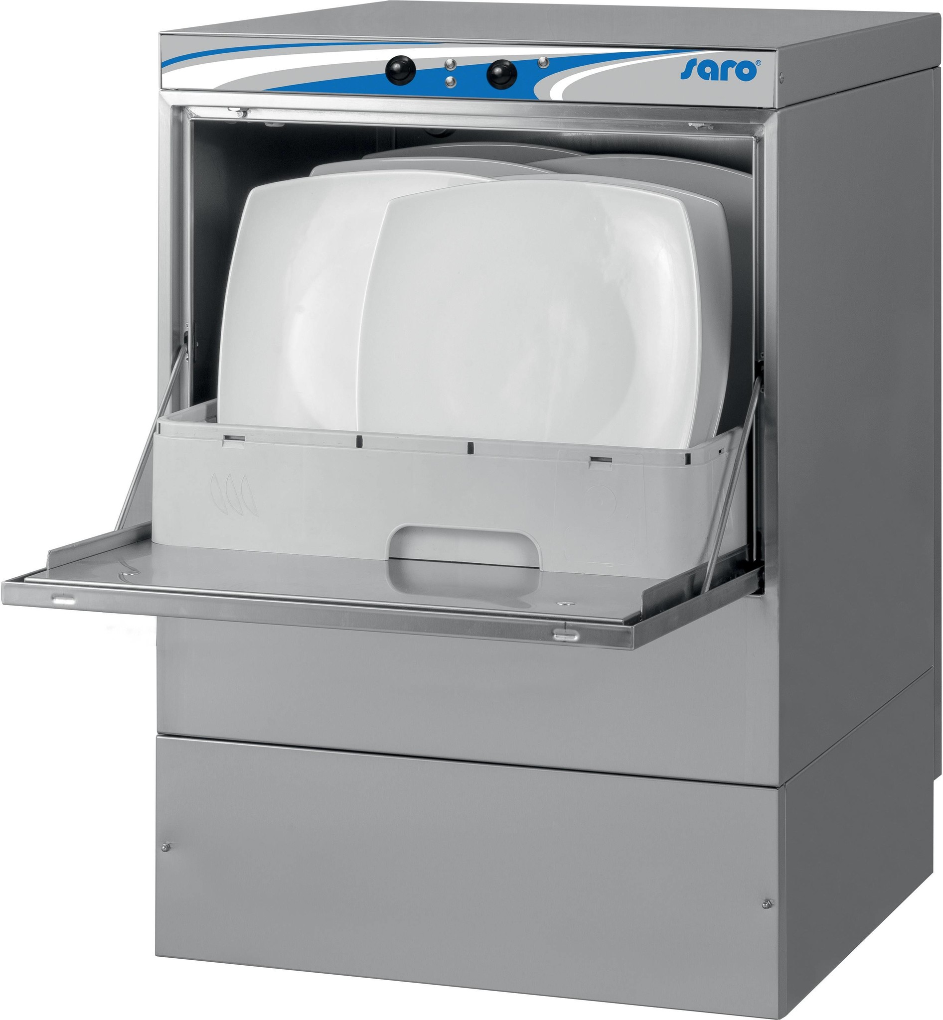 Saro vaatwasmachine met wasmiddelpomp, hydraulische spoelpomp, afvoerpomp en vuilfilter met korven van 50x50cm. Model MARBURG. Wordt geleverd met glazenmand, bestekmand en korf. Cyclus 120 seconden. Dubbelwandige deur, vulhoogte 360 mm Lees meer