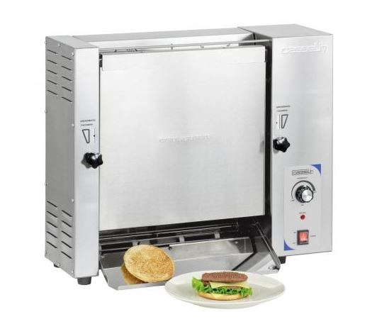 Verticale toaster type 900 met twee elementen en een automatische doorvoer. Productie capaciteit 1200 toast of 600 burgerbroodjes 24 seconden per toast Lees meer