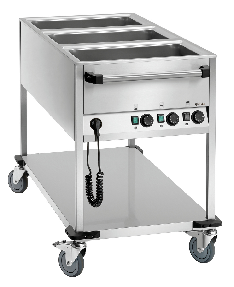 Dankzij drie afzonderlijk regelbare GN-bakken (elk 1/1 GN, tot 200 mm diep) kunnen verschillende gerechten tegelijkertijd en nauwkeurig op temperatuur worden gehouden – ideaal voor gevarieerde menu's. De temperatuurgeregelde, waterverwarmde uitgiftewagen houdt een constante temperatuur van 30 tot 90 °C aan – voor een gelijkmatige warmteverdeling en optimale voedselkwaliteit. Vier soepel lopende zwenkwielen (waarvan twee vergrendelbaar) en de praktische spiraalaansluiting maken een flexibel en veilig gebruik mogelijk overal waar warm gehouden gerechten nodig zijn.