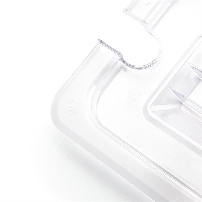 Deksel met lepeluitsparing voor de GN 1/6 bakken. De nagenoeg onbreekbare polycarbonaat constructie blijft koel aanvoelen. Bestand tegen temperaturen van -40°C tot +100°C. Vaatwasserbestendig. Bakken worden apart verkocht.
