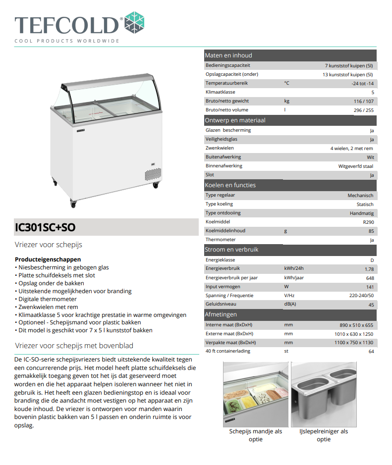 dat geserveerd moet worden en die het apparaat helpen isoleren wanneer het niet in gebruik is. Het heeft een glazen bedieningstop en is ideaal voor branding die de aandacht moet vestigen op het apparaat en zijn koude inhoud. De vriezer is ontworpen voor manden waarin bovenin plastic bakken van 5 liter passen en onderin ruimte is voor opslag.