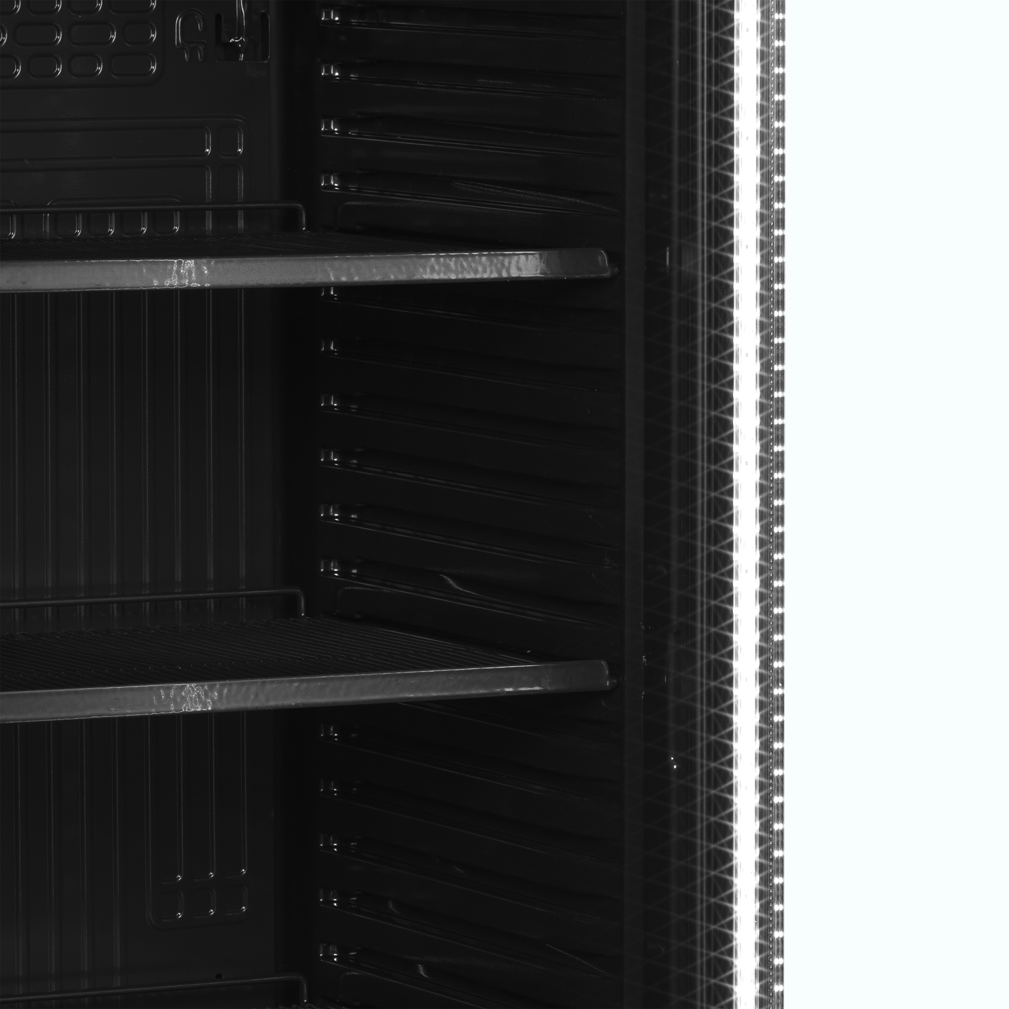 Laag energieverbruik|Zwarte binnen- en buitenkant|Elegant design|Uitstekende productpresentatie|Verlichte kap|Ideaal voor branding.|Ledverlichting in deurlijst|Instelbare planken|Ventilatorkoeling|Slot Lees meer